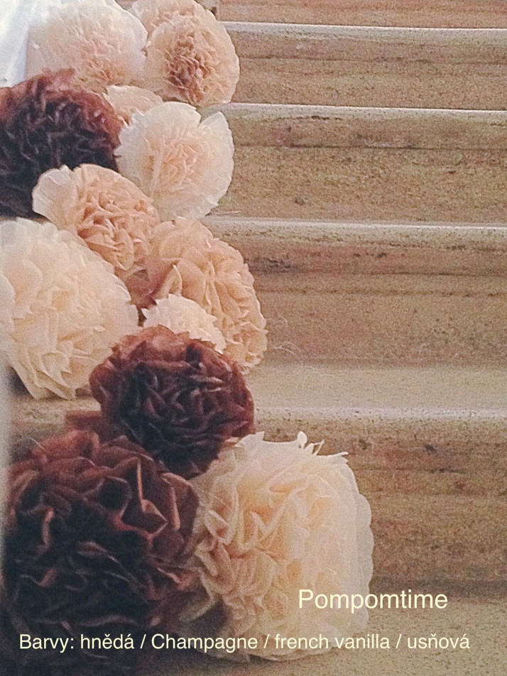 Dekorace schodiště - pompomky různých velikostí v barvách: Champagne, French Vanilla, usňová, hnědá