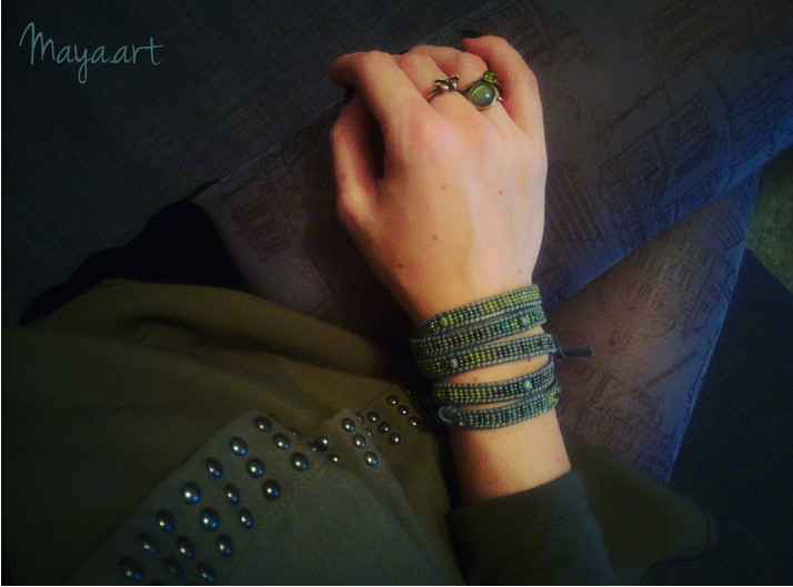 Wrap náramek v zelenošedé vyrobený z šedé kožené šňůry a rokajlu a broušených korálků v zelených a šedých tónech.