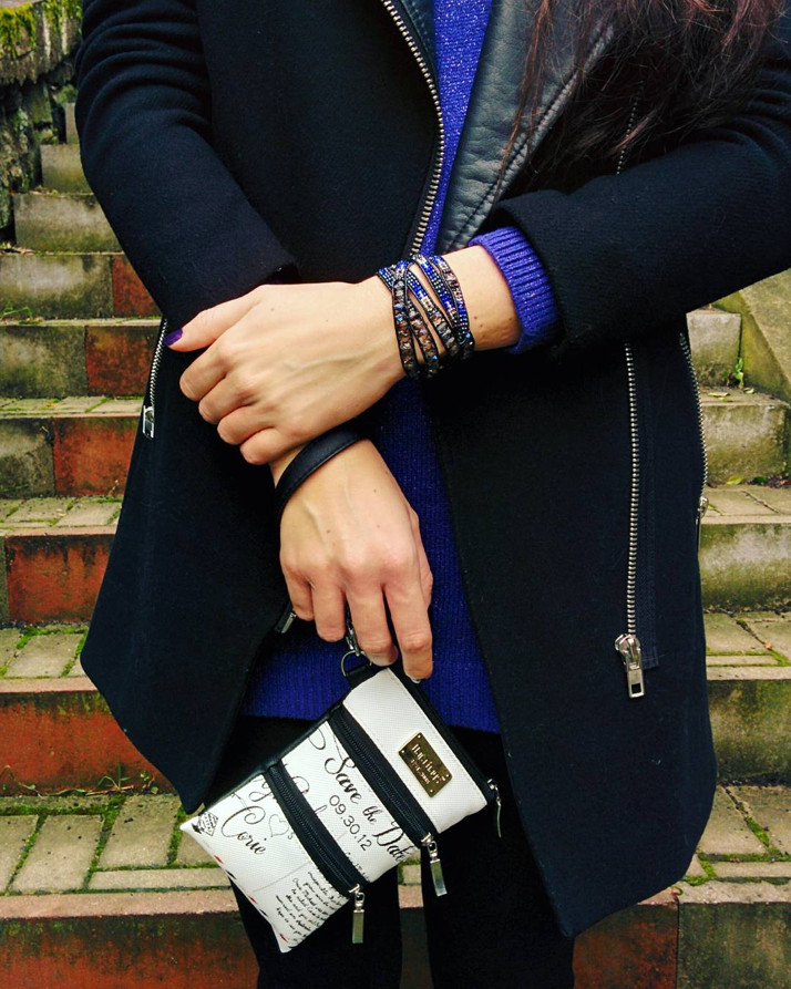 Wrap náramek z černé kožené šňůry a modrých, stříbrných a šedých korálků. Styling dolaďuje malá taštička na nezbytnosti od Darabags.