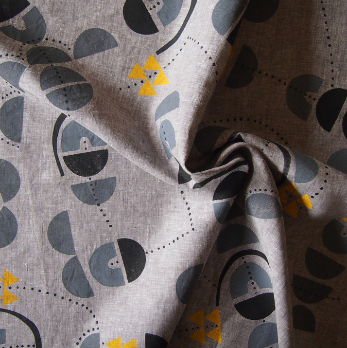 Jemné lněné plátno šedý melír s ručním otiskem.