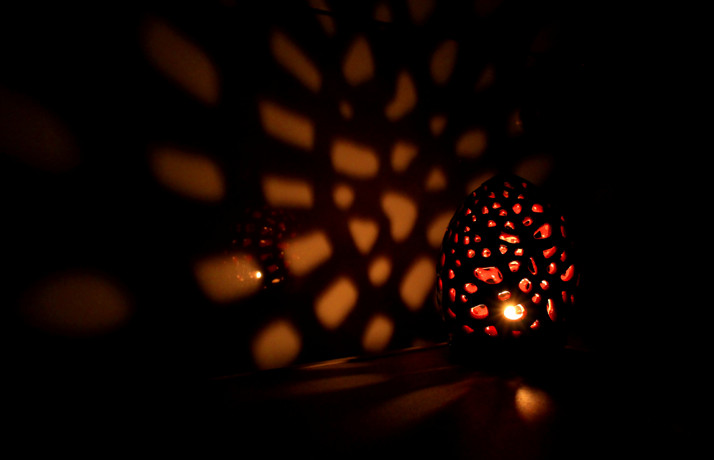 Krásný efekt, díky 2 barevnosti. Z venku je vajíčko žluté (za dne), ze vnitř červené. Svítí červeně, díky odrazu světla. Tento efekt používám ráda a a často.