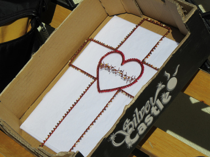 Z měděných lakovaných drátů a rokajlu Preciosa s hranatou dírou vznikl tento 3D kříž. Srdce v jeho středu je přizdobeno drátovanou trnovou korunou, která je lehce vypouklá - vzniká tak prostorový efekt.