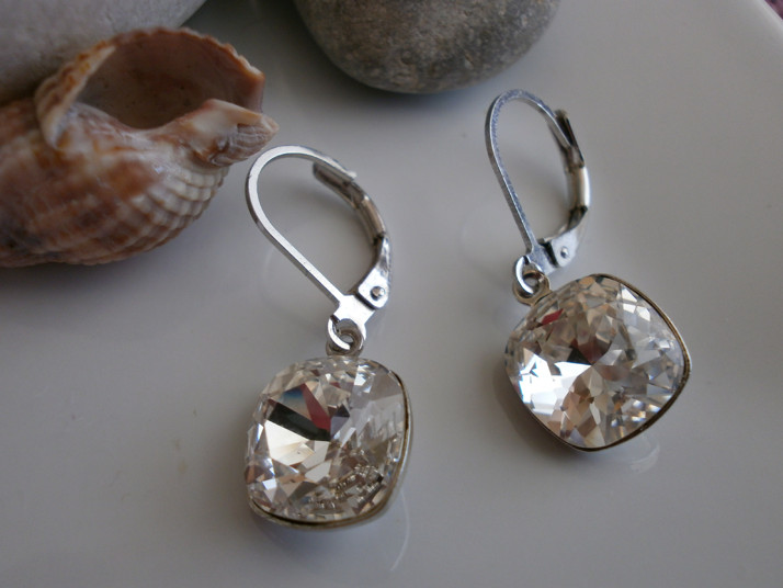 náušnice rhodiované čtvereček -klapky bimbací v barvě Crystal