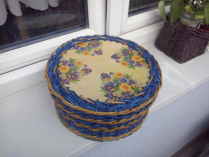 Tak další hotový košík s víkem. Barva: mořidla Chevas - modrá a světlý dub. Styl pletení: Plátnová vazba.
