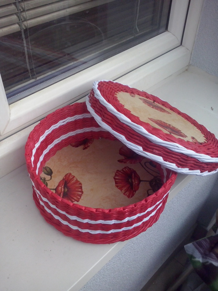 Tak další hotový košík s víkem. Barva: mořidla Chevas - Turecká červeň a bílá. Styl pletení: Pletení dvěma ruličkami