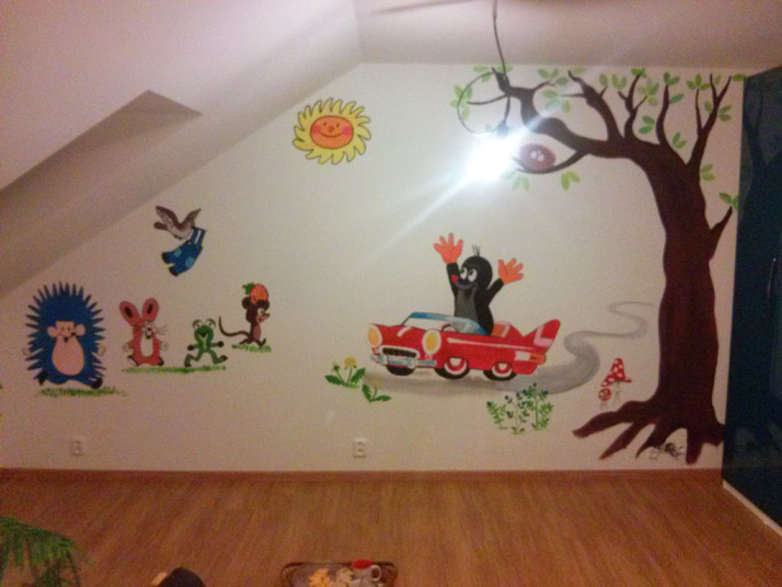 Pokojíček pro Matěje a Vojtu, hlídá je tam celá krtečkova parta, plocha cca 5x2,5metru, práce 12 hodin, akvarelové barvy