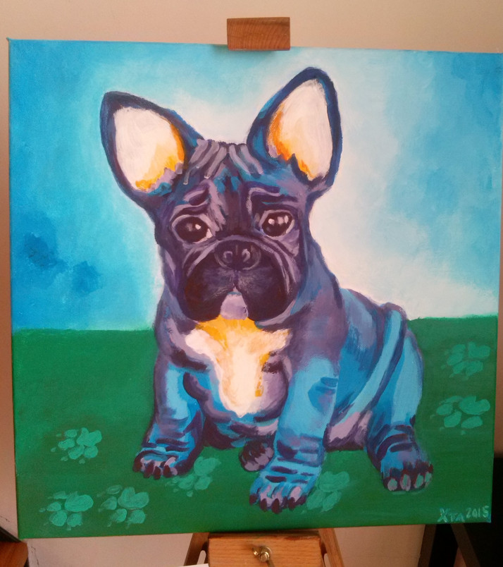 Akvarel 40 x 40cm, nevinný buldoček, co potapkal čistou podlahu