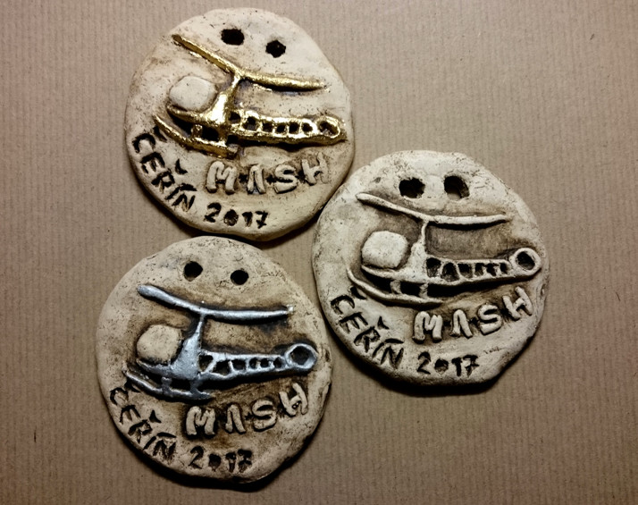 medaile pro dětský tábor, celotáborová hra: MASH, zaltá stříbrná a bronz por vítěze olympiady, keramika, 8cm průměr