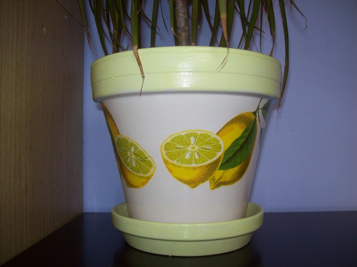 Velký květináč, ubrouskovou technikou nalepeny citróny, následně přelakováno.
