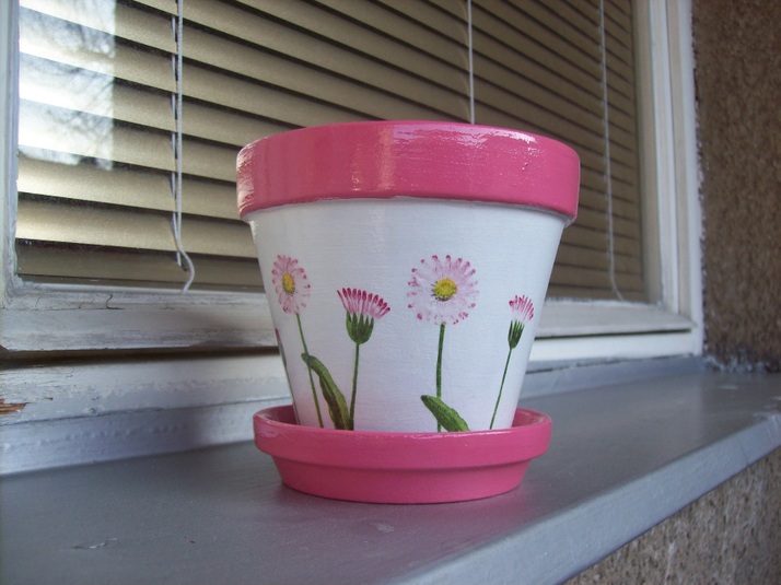 Střední květináček, ubrouskovou technikou na nabarvený květináč nalepeny sedmikrásky, přelakováno lesklým lakem