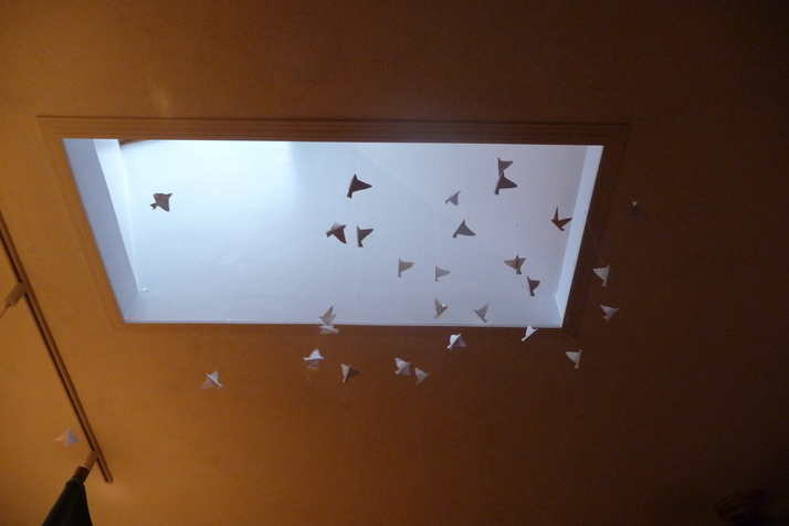 Ptáčci vyřezaní z ručního papíru vyšší gramáže, na silonech, zavěšeni pod zvláštním střešním oknem. Moje kamarádka je výtvarnice každým coulem a tenhle kout jejího domečku miluji ze všech nejvíc. Tracy, mávám, ti za oceán.♥
