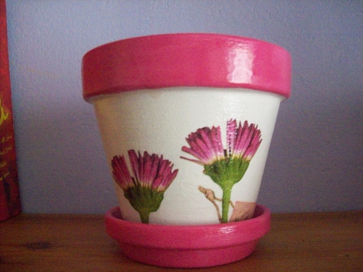 Menší květináček, natřen bílou barvou, okraje růžové, následně nalepeny květiny ubrouskovou technikou. Přelakováno lesklým lakem.