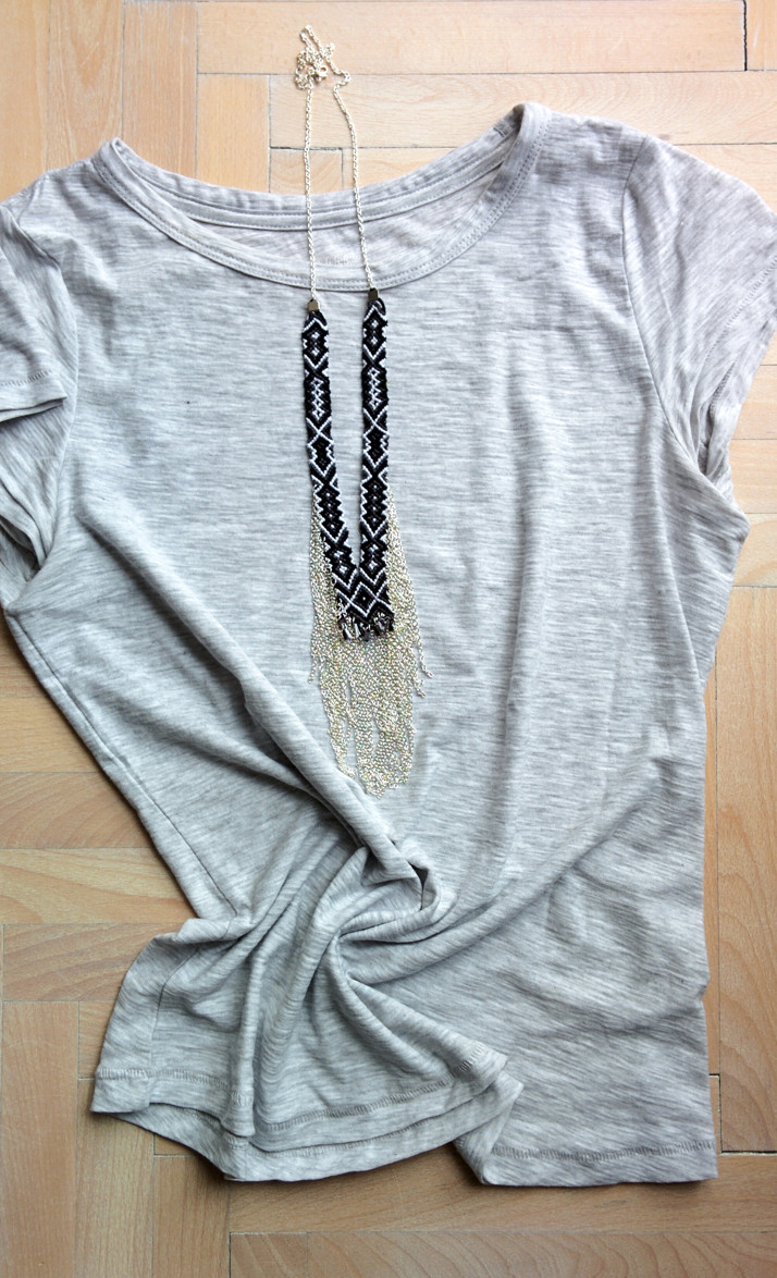 Jednoduché tričko pozvedne výrazný náhrdelník v originální outfit.