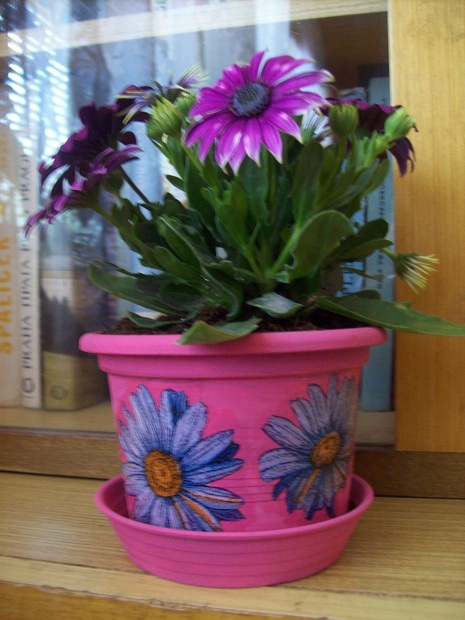 Plastový, menší květináček, natřen růžovou barvou, ubrouskovou technikou nalepeny modré květiny, přelakováno.