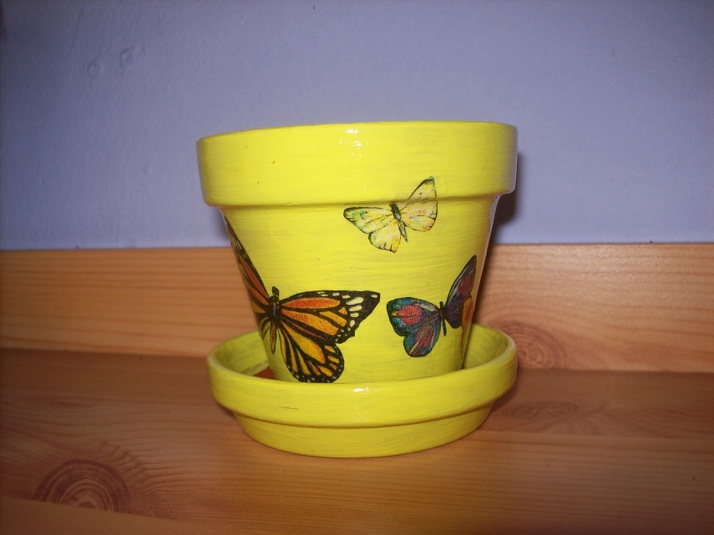 Malinkatý keramický květináček, natřen žlutou barvou, ubrouskovou technikou nalepeny motýlci, přelakováno lesklým lakem.