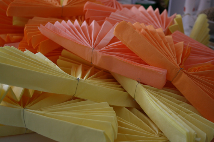 Žluté, meruňkové, broskovové pompomky na svatbu