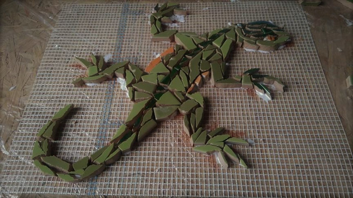 Prvotní fáze mozaiky - poskládáno, přilepeno na perlinku. Bude následovat osadit na zeď a spárování.