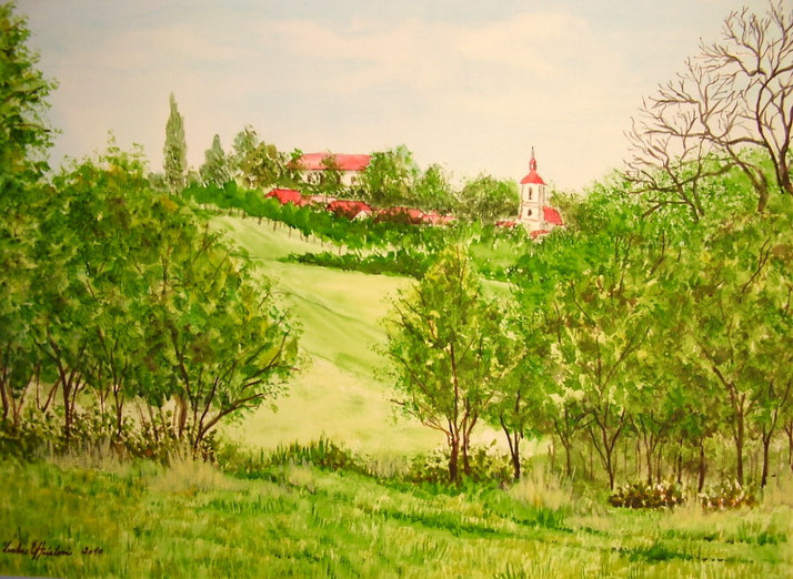 Pohled na Habrovany, od Skalky - akvarel, z r. 2010.