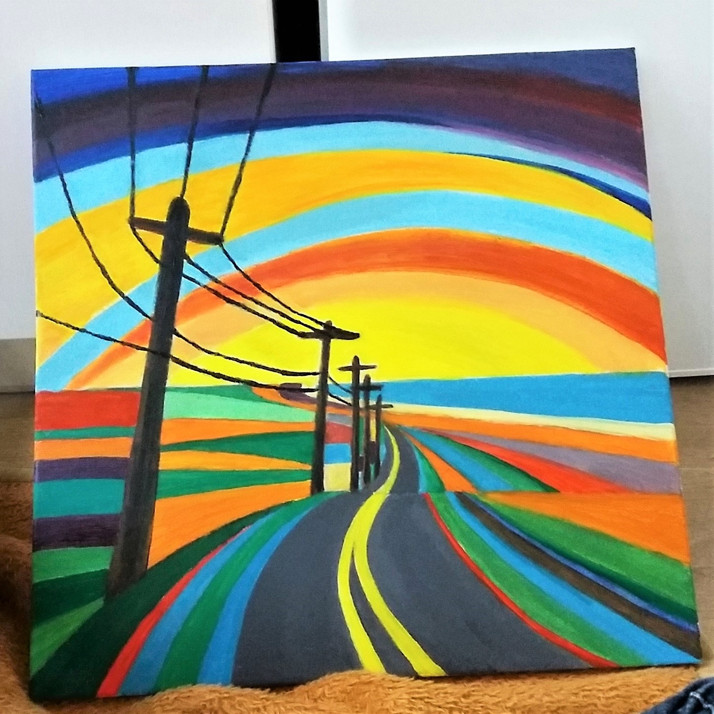 barevné rozpracování Old Montauk Highway akrylem na plátně rozměrů padesát na padesát centimetrů