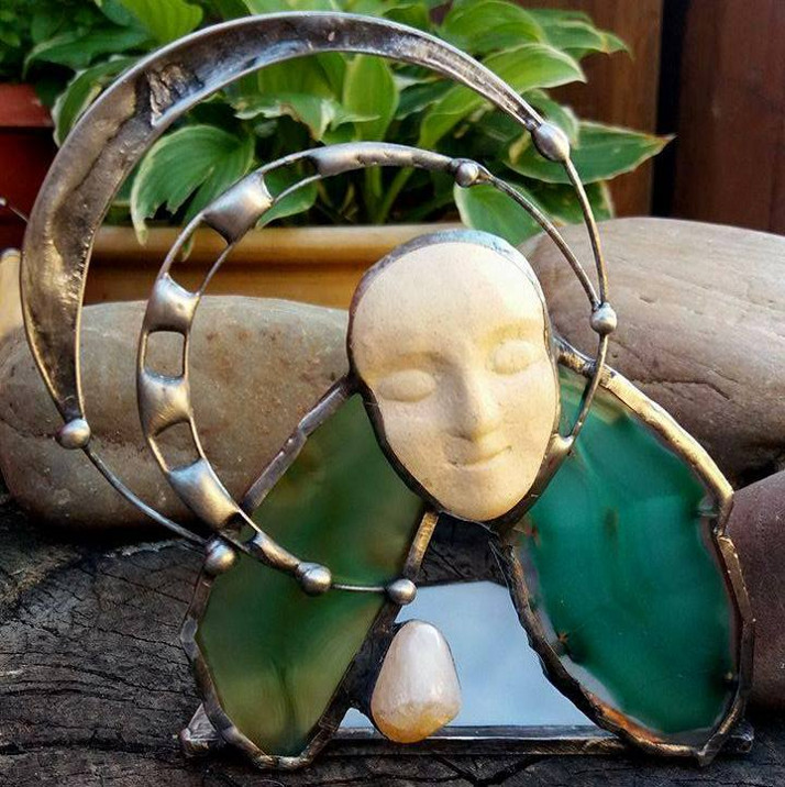 Magické svícny vytvořené pomocí tiffany techniky. Tělo tvoří plátky achátu doplněné vzácným kamenem CITRÍNEM . Hlavička na svícnu je z keramiky, vše je patinováno. Svícen je na čajovou svíčku, kdy světlo prochází přes kameny a navozuje příjemnou a kouzelnou atmosféru.