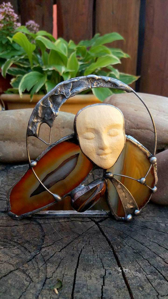 Magické svícny vytvořené pomocí tiffany techniky. Tělo tvoří plátky achátu doplněné vzácným kamenem TYGŘÍM OKEM. Hlavička na svícnu je z keramiky, vše je patinováno. Svícen je na čajovou svíčku, kdy světlo prochází přes kameny a navozuje příjemnou a kouzelnou atmosféru.