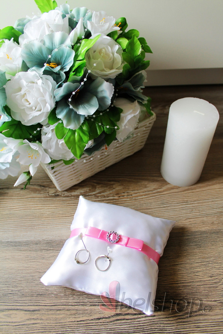 polštářek pod prstýnky s růžovou stuhou