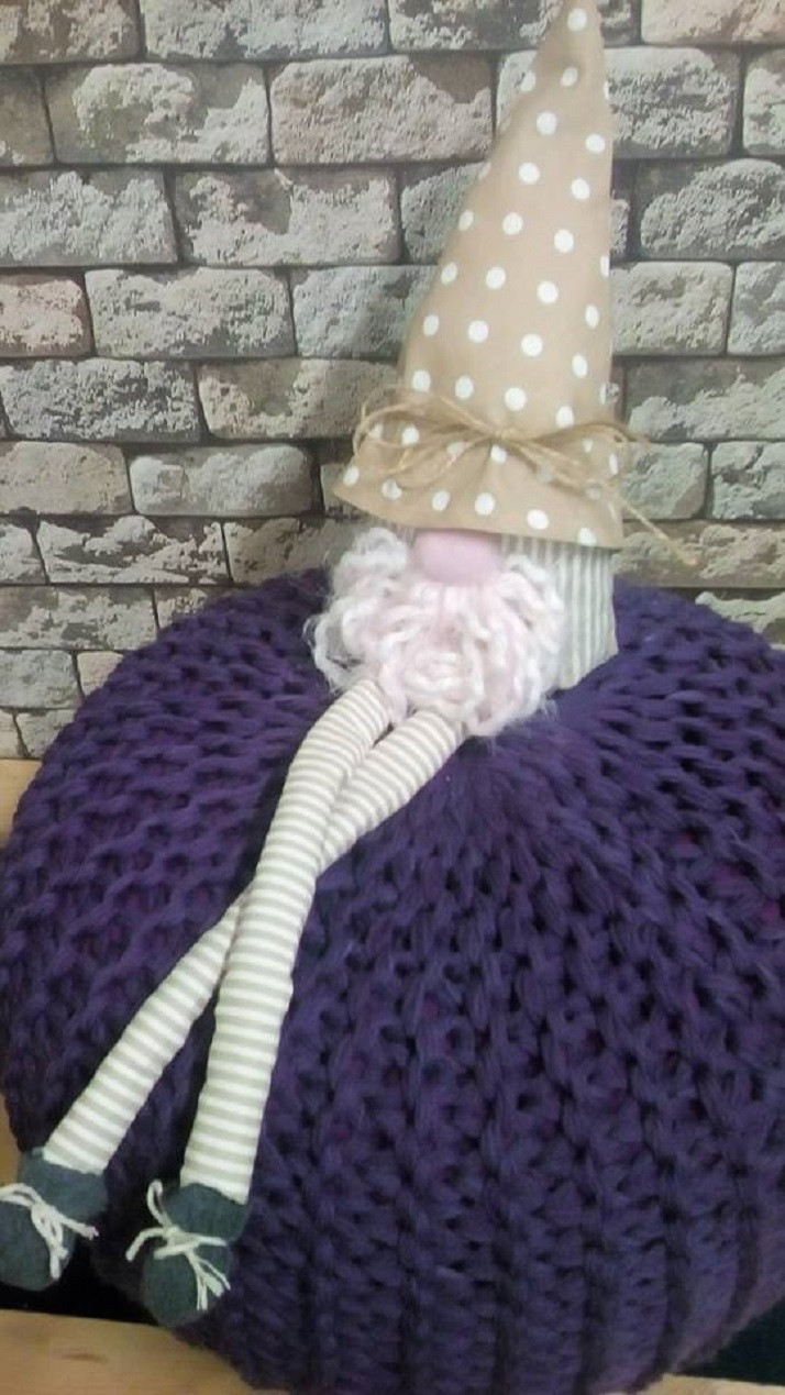 Krémový puntíkovaý skřítek má háčkovené tělíčko s ručně šitými doplňky, dno vyplněné slupkou pohanky zbytek duté vlákno. Výška skřítka cca 20cm.
