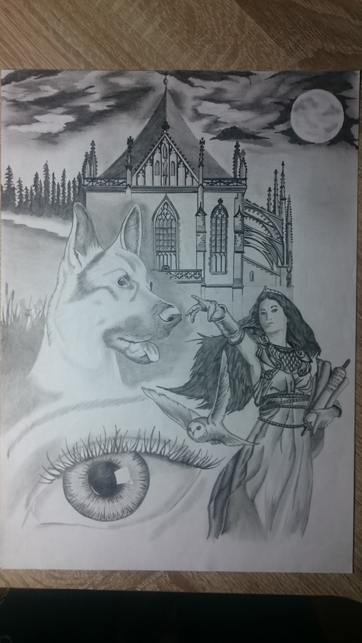 Na téhle A4 jsem se pokusil seskupit objekty, které jsem kdysi chtěl jako tetování. Každý z nich mě nějak charakterizuje nebo má důvod proč tam být. Chrám sv. Barbory v Kutné hoře, Pes, Athéna. Oko už mezi ně nepatří, pouze jsem chtěl vidět jak bude vypadat mezi tím vším.