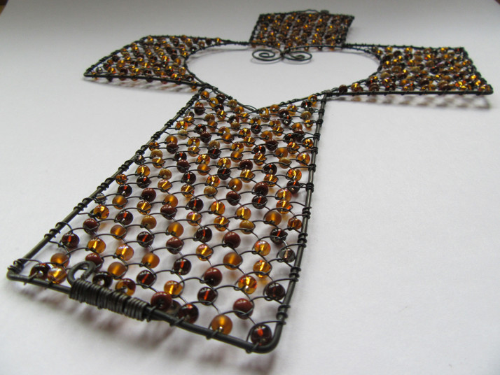Nástěnný kříž z černého drátu a několika odstínů hnědého rokajlu české výroby.