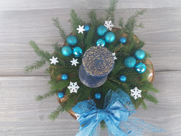 Vánoční svícen modrý na přírodní kulatine z jabloně