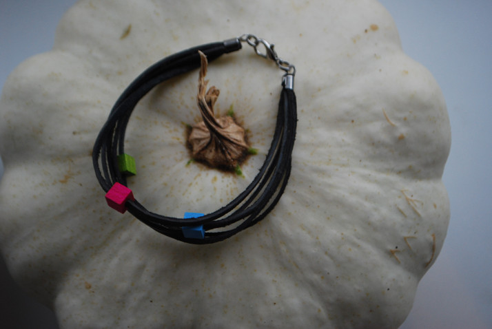 Jiná varianta koženého náramku s dřevěnými barevnými kostičkami..