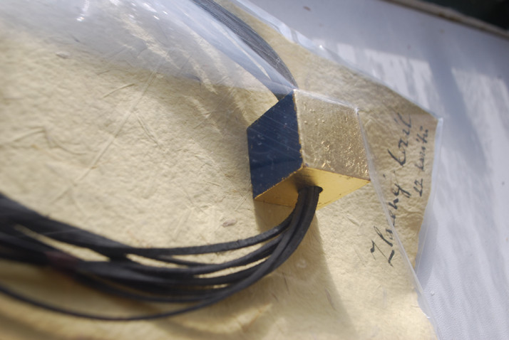 Náhrdelník je vyrobený z šedých kožených řemínků na které je navlečená modrá kostka, která je nazlacená 22 karátovým zlatem.