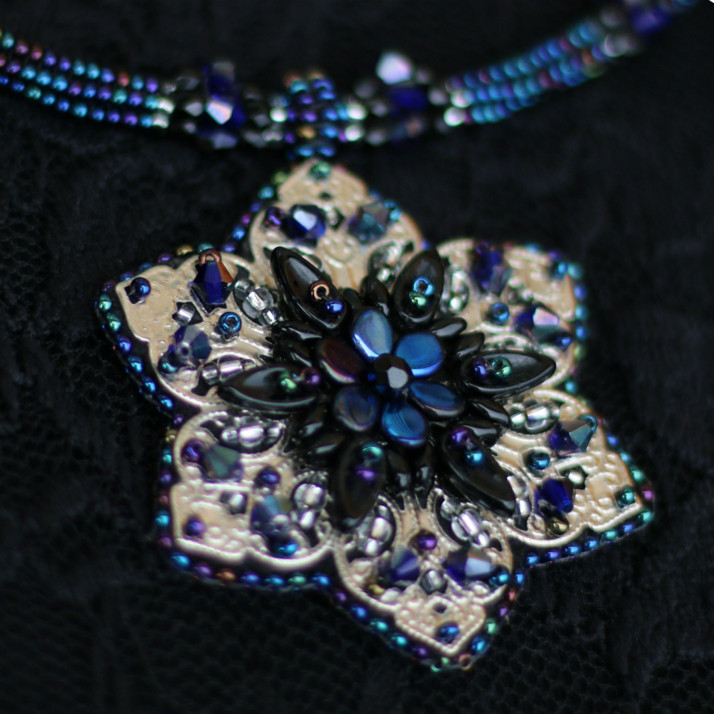 Náhrdelník z květinového filigránu s korálkovou výšivkou, na obruči obšité herringbone stehem