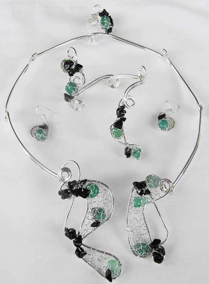 Postříbřený komplet zdobený velkými aventuriny doplněné drobnými onyxy