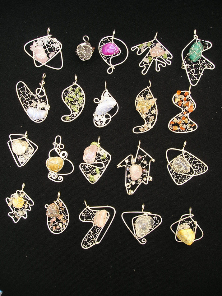 Postříbřené drátěné závěsy s velkým polodrahokamem doplněné drobnými polodrahokamy.