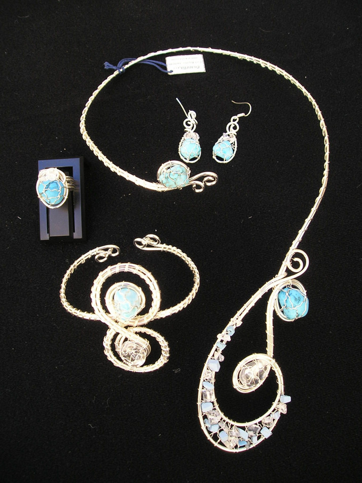 Postříbřený komplet zdobený velkým tyrkysem a křišťálem.