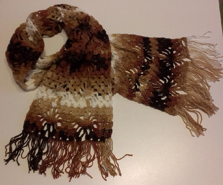 Ručně háčkovaná šála délka 2m x 30cm ,100% akryl ,příjemný materiál .Barevné části se střídají dle návinu v klubíčku.