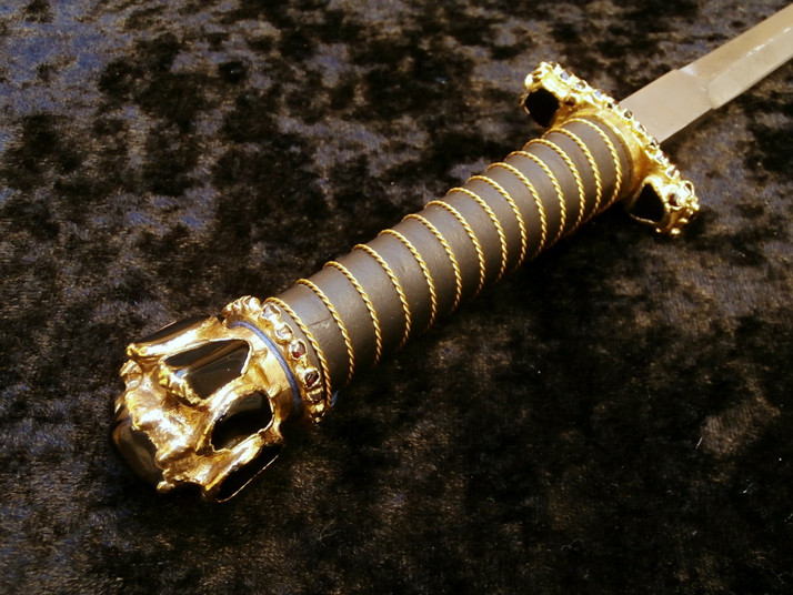 Zlacený stilet z kované oceli s rukojetí vykládanou obsidiány a granáty. Celková délka 28 cm, z toho délka čepele 17 cm, délka rukojeti 11 cm. Čepel je široká 1 cm, šířka záštity je 4,5 cm.