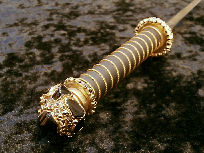 Zlacený stilet z kované oceli s rukojetí vykládanou obsidiány a granáty. Celková délka 29 cm, z toho délka čepele 17 cm, délka rukojeti 12 cm. Čepel je široká 1 cm, kruhová záštita má průměr 3 cm.