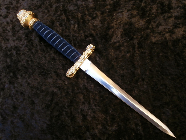 Zlacená dýka z kované oceli s rukojetí vykládanou opály a opality. Celková délka 36 cm, z toho délka čepele 21 cm, délka rukojeti 15 cm. Šířka čepele 2 cm, šířka záštity 7 cm.