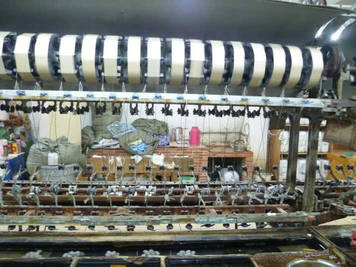 Z několika kokonů najednou se spřádají jednotlivá vlákna a namotávají se na cívky.