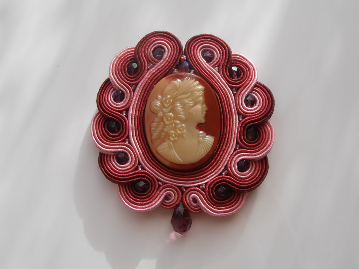 Brož s kamejí je vyrobená ze sutašek,TOHO korálků, ohňovek a skleněné slzičky. Rub je zapošitý filcem, spínací špendlík je z chirurgiské oceli.
