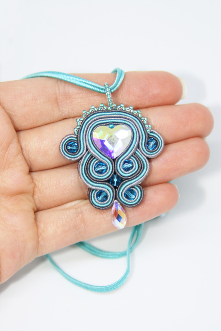 Přívěsek ze sutašek, Swarovski Heart Flat Back AB, Swarovski Briolette Pendant AB, ohňovek a TOHO korálků. Rub je zapošitý filcem. Korálkové zapínání, přívěsek je zavěšen na sutašce.