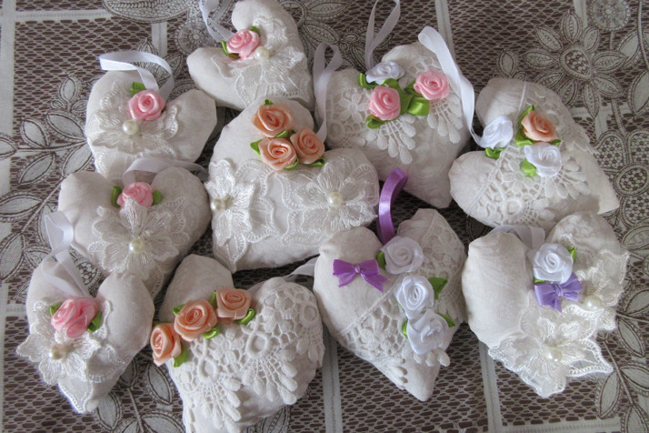 srdíčko je ušité z bavlny, krajky, látkové růžičky. Velikost 8 cm cena 40 Kč.