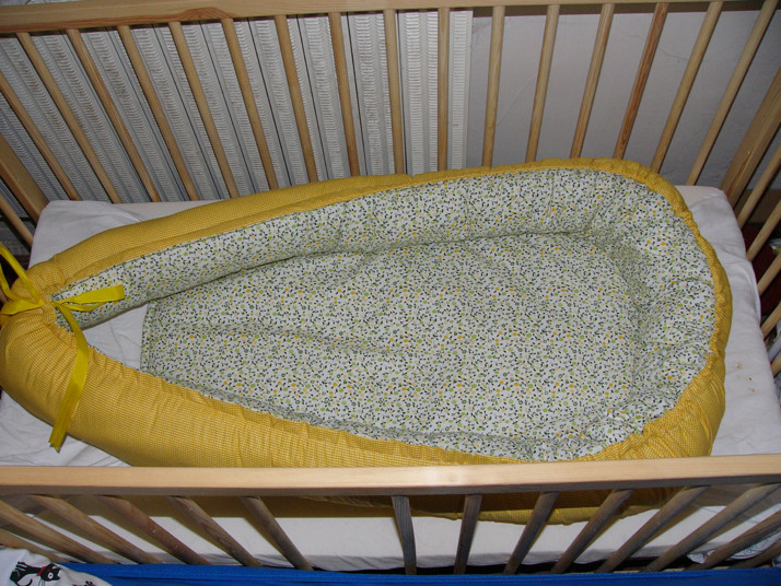 Hnízdečko inspirované jarem. Žlutá kostka z jedné strany a z druhé jarní žluté květy. Velikost plochy pro ležení je 70*40 vejde se i 7 měsíční miminko.