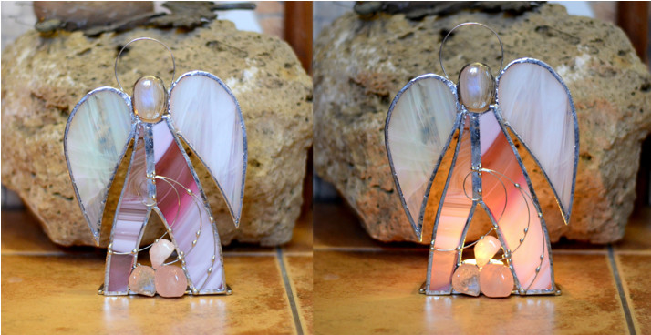 Růžový andělíček svícen s růženínem, křišťálem a mléčným křemenem