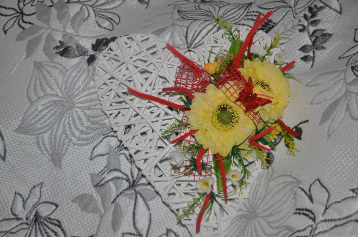 Srdce na pověšení na dveře. Základ bílý. Dozdobené do žluto- červené barvy.