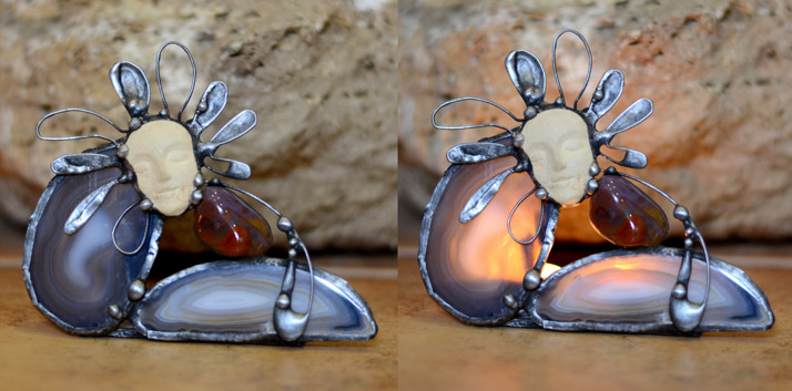 Svícen z plátků achátu se zkamenělým dřevem