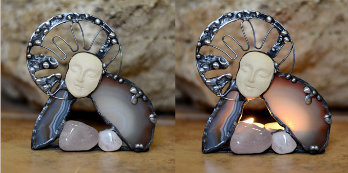 Svícen z plátků achátu s růženínem a mléčným křemenem