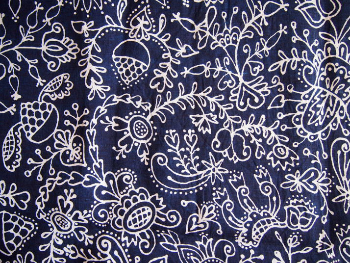 ručně malované folklorní ornamenty na silnějším lněném modrotiskovém plátně